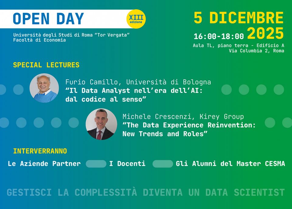 Vuoi costruire una carriera nel mondo della Data Science e dell’Intelligenza Artificiale? L’Open Day della XIII Edizione del Master CESMA è l’occasione giusta per scoprire da vicino un percorso formativo full-time e in presenza, progettato per offrire un apprendimento immersivo, interazione diretta con docenti e professionisti, e un ambiente ideale per fare networking reale.