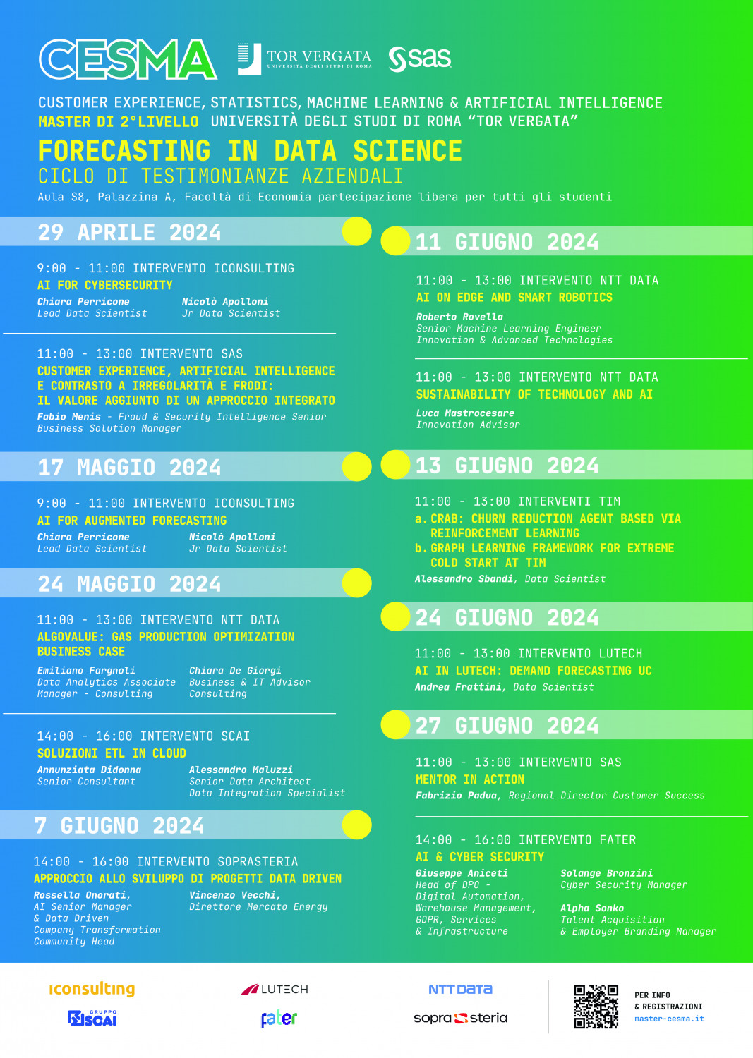 Anche quest’anno il Master CESMA, Master di II livello in Customer Experience, Statistics, Machine learning & Artificial Intelligence, offre un ricchissimo ciclo di testimonianze aziendali aperto a tutti gli studenti interessati, con l’obiettivo di mostrare le migliori practices e solutions di Intelligenza Artificiale per le previsioni e decisioni in ambito aziendale. I partner del Master Cesma (SAS, NTT Data, Lutech, IConsulting, Sopra Steria e SCAI group) contribuiscono con questo ciclo di incontri ad allineare la preparazione dei nostri studenti alle richieste del mondo del lavoro.